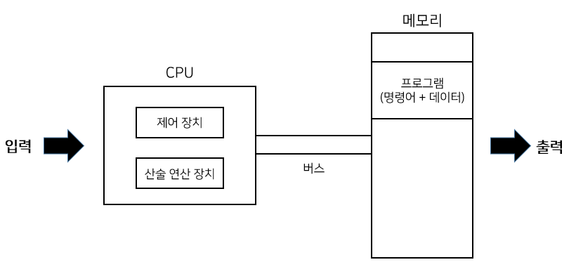 폰 노이만 아키텍처는 중앙처리장치(CPU), 메모리, 프로그램 세 가지 요소로 구성된다. CPU와 메모리는 서로 분리되어 있고 둘을 연결하는 버스를 통해 명령어와 데이터의 읽고 쓰기가 가능하다. CPU가 메모리로부터 명령어를 가져오는 fetch, 명령어를 해석하는 decode, 명령어를 실행하는 execute, 처리 결과를 메모리에 저장하는 store 순서의 사이클로 프로그램을 실행한다. 또한 폰 노이만 아키텍처는 내장 메모리 순차 처리 방식을 기반으로 하기에 한 번에 하나의 명령어를 실행한다.