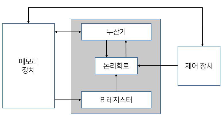 위 그림은 ALU의 블럭 다이어그램이다. ALU의 주 목적은 메모리에 저장되어 있는 2진 데이터를 받아들이고, 제어 장치의 명령에 따라 이 데이터에 산술과 논리 연산을 실행하는 것이다. ALU는 산술과 논리 연산을 수행하는 논리 회로와 최소 2개의 플립플롭 레지스터를 포함하는데 누산기와 B 레지스터가 그것이다. 산술/논리 연산을 수행하는 논리 회로는 입력으로 B 레지스터와 누산기의 2진 데이터를 받아 제어 장치의 제어 비트에 따라 정해진 연산을 수행하고 그 결과를 누산기에 저장한다.