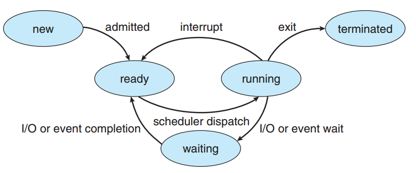 - waiting : 프로세스가 어떤 이벤트(입출력 완료 또는 신호의 수신 같은)가 일어나기를 기다린다.