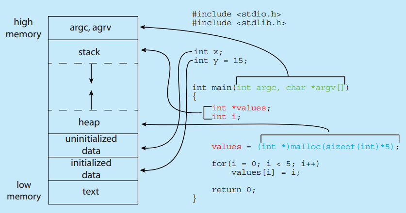 텍스트와 데이터 섹션은 크기가 고정되어 있으며 스택과 힙 섹션은 서로의 방향으로 커진다. 아래는 C 프로그램의 메모리 배치이다. 위의 메모리 배치와 거의 비슷하지만 argc, agrv 매개변수가 저장되는 별도의 섹션이 있으며 데이터 섹션은 초기화된 데이터와 초기화되지 않은 데이터를 저장하는 서로 다른 섹션으로 나뉜다.