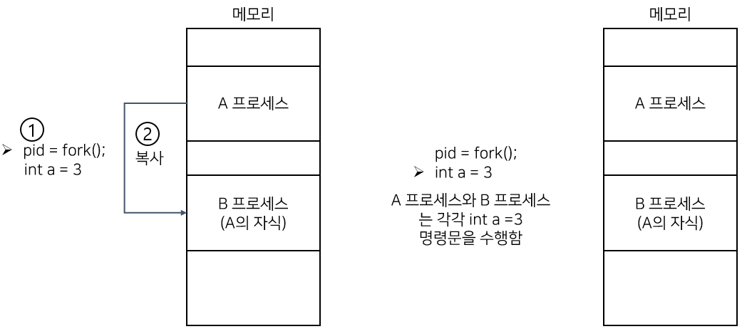 - 자식 프로세스는 부모 프로세스의 복사본이다. (자식 프로세스는 부모와 똑같은 프로그램과 데이터를 가진다.)