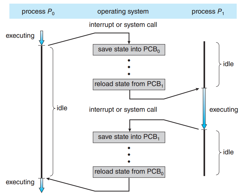 어떤 프로세스를 실행하다가 나중에 다시 그 프로세스를 실행하려면 어떻게 해야될까? 프로세스의 context(문맥)을 저장해 두었다가 다시 불러오면 다시 실행할 수 있다. 프로세스의 context는 PCB에 표현된다. context는 CPU 레지스터의 값, 프로세스 상태, 메모리 관리 정보 등을 포함한다. cpu 코어가 프로세스를 전환할 때 context switch(문맥 교환)가 발생한다. context switch란 이전의 프로세스 context를 보관하고 새로운 프로세스 context를 복구하는 작업을 말한다. context switch 동안 cpu 코어는 아무런 일도 하지 못하기에 context switch는 오버헤드이다.