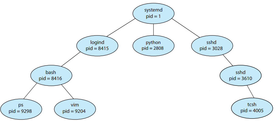 아래는 리눅스의 전형적인 프로세스 트리를 보여준다. pid가 1인 systemd 프로세스가 모든 사용자 프로세스의 루트 부모 프로세스 역할을 수행하고 시스템이 부트될 때 생성되는 첫 번째 사용자 프로세스이다. 시스템이 부팅되면 systemd 프로세스는 다양한 사용자 프로세스를 생성한다. systemd 프로세스가 로그인 하는 사용자 관리를 담당하는 logind 프로세스를 생성하고 logind 프로세스는 bash 셸 프로세스를 생성하고 bash 셸 프로세스는 ps와 vim 프로세스를 생성하는 것을 볼 수 있다.