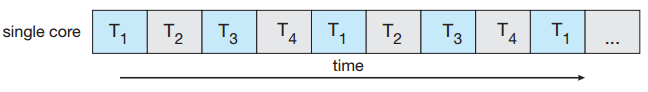 멀티코어 시스템에서 코어 개수만큼 스레드를 병렬로(parallel) 실행하며 각 cpu 코어는 매우 빈번하게 작업(스레드)를 전환하며 실행해 스레드를 동시에(concurrently) 실행한다.
