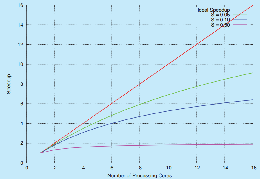 암달의 법칙에서 재밌는 점은 N이 무한대에 가까워지면 성능 이득은 1/S에 수렴한다. 즉 응용 프로그램의 순차 실행 부분이 50%를 차지한다면 코어를 아무리 늘려도 성능 이득은 2배를 넘지 못한다. 따라서 S가 클수록 아무리 코어가 많아도 성능 향상을 기대하지 못한다는 걸 시사한다.