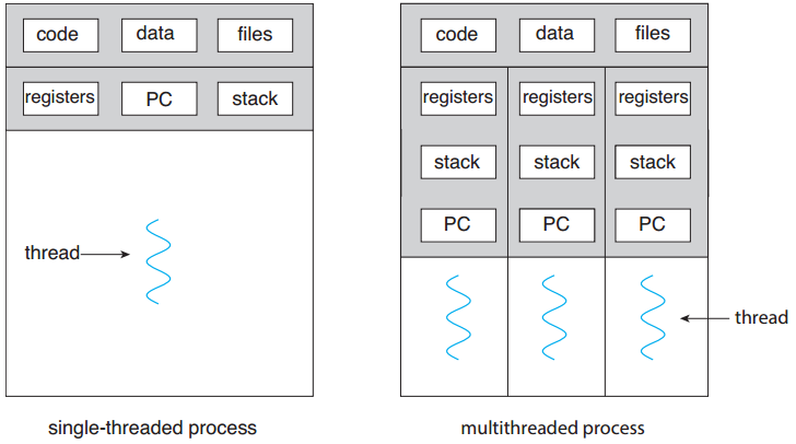 - 스레드는 스레드 ID, 프로그램 카운터(PC), 레지스터 집합, 스택으로 구성된다.
