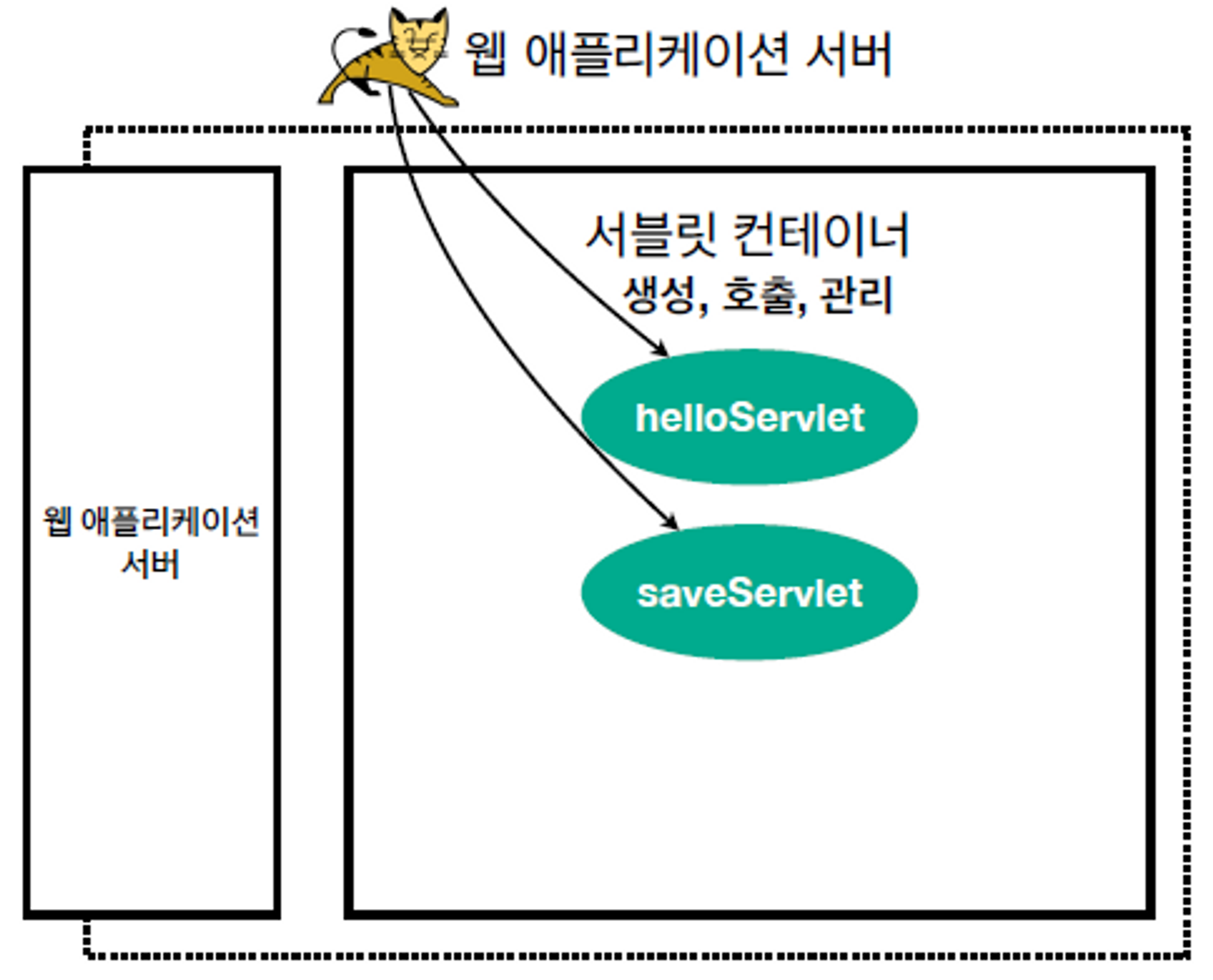 서블릿을 지원하는 WAS 안에는 서블릿 컨테이너가 있는데 서블릿 컨테이너 속 서블릿 객체가 관리 된다.