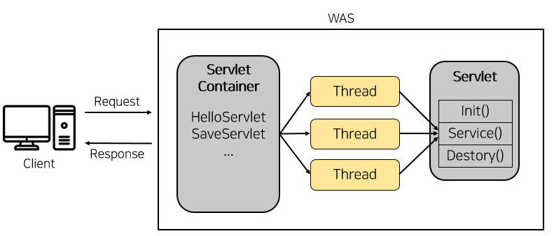 동시 요청을 처리하기 위해 WAS는 요청마다 대기 중인 쓰레드가 요청에 대응하는 서블릿 객체의 service() 메서드를 호출한다. 따라서 요청이 동시에 들어와도 처리할 수 있다.