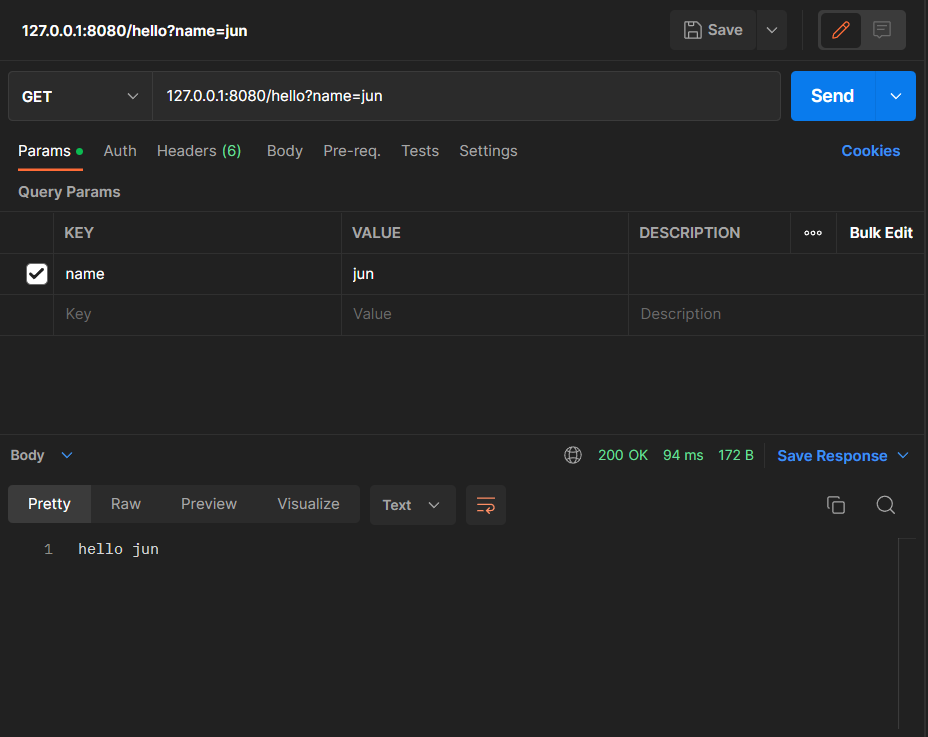 http://127.0.0.1:8080/hello?name=jun URL로 요청을 보내면 아래의 응답 메세지를 확인할 수 있다.