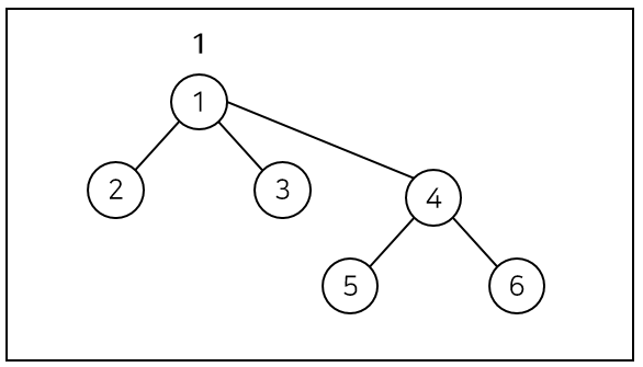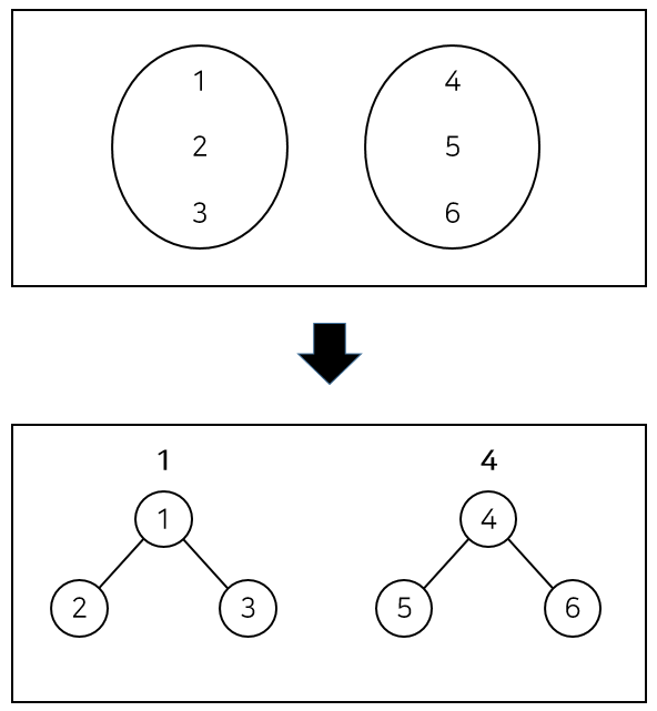분리 집합을 아래와 같이 트리로 표현한다. 트리로 표현하면 union 연산과, find 연산을 효율적으로 수행할 수 있다. 트리의 루트노드가 집합명(집합을 구분하는 key)이다. 현재 1번 집합과 4번 집합이 있으며 1, 2, 3번 노드는 1번 집합에 4, 5, 6번 노드는 4번 집합에 속해있다.