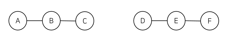 이때 B 도시와 E 도시가 서로 연결되어 있는지 확인하고 싶다. 어떻게 확인할 수 있을까? 첫 번째 해결책으로 B 노드부터 시작해 그래프 탐색을 하면 된다. 이 경우 시간 복잡도는 O(N)이 된다. 두 번째 해결책으로 Union-Find 자료구조를 적용한다. A, B, C가 하나의 집합이 되고 D, E, F가 하나의 집합이 된다. 따라서 find 연산으로 B와 E가 같은 집합인지 확인하면 된다. 이 경우 시간 복잡도는 최대 O(N), 최소 O(1)이 된다.