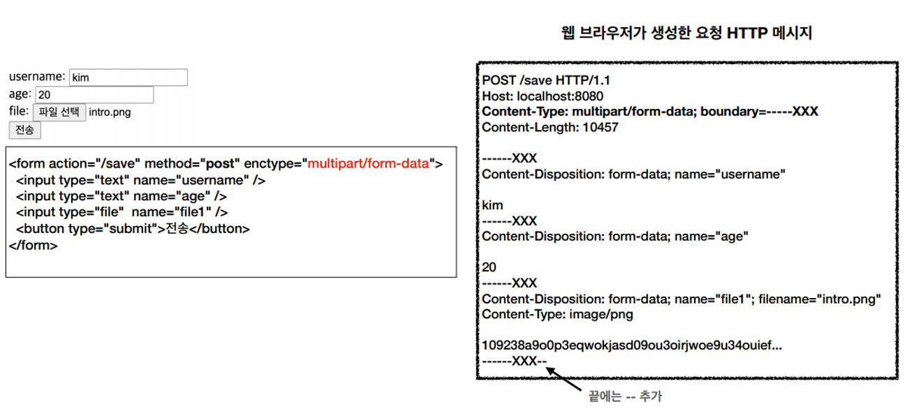 - 파일 업로드 같은 바이너리 데이터 전송 시 사용