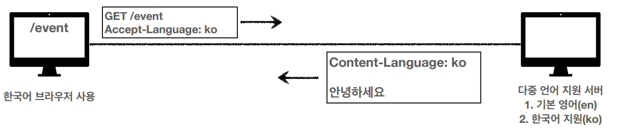 예를 들어보자. 다중 언어를 지원하는 서버에 Accept-Language 헤더없이 요청한다면 기본 자연어 언어로 된 표현을 응답한다.