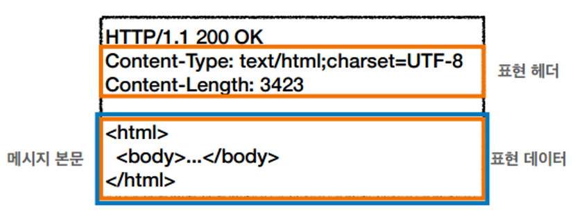 표현은 요청이나 응답에서 전달할 실제 데이터이며 표현 헤더는 표현 데이터를 해석할 수 있는 정보 제공