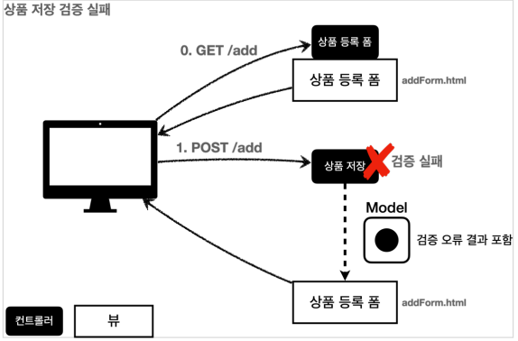 위 시나리오에서 POST 메서드로 전달한 데이터가 잘못된 형식이거나 허용되지 않는 값이면 어떻게 해야할까? 서버 측에서는 입력값에 대한 검증 로직을 수행한다. 검증이 실패하면 다시 상품 등록 폼(화면)을 보여주고 해당 화면에서 어떤 값을 잘못 입력했는지 오류 메시지를 출력하는 식으로 검증 실패 처리 로직을 구현할 수 있을 것이다.