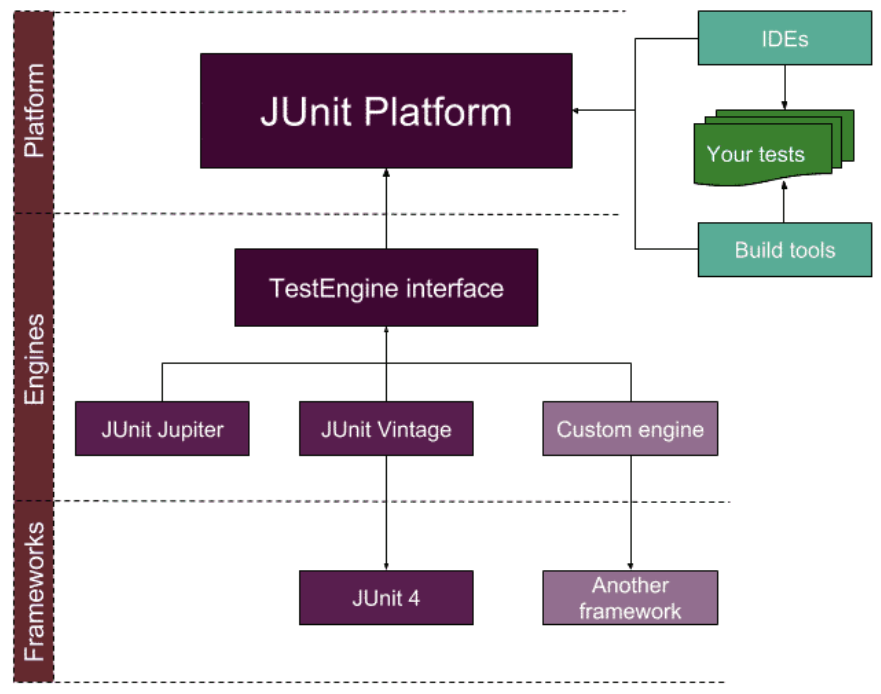 - JUnit Platform : JUnit Platform은 테스트를 발견하고 테스트 계획을 생성하는 테스트엔진 인터페이스를 정의하고 있다. Platform은 TestEngine을 통해서 테스트를 발견하고, 실행하고, 결과를 보고한다.