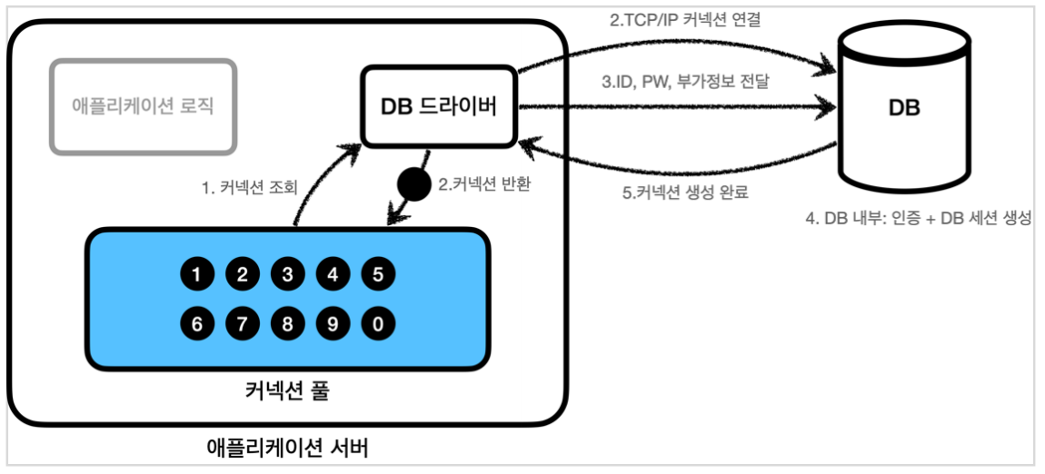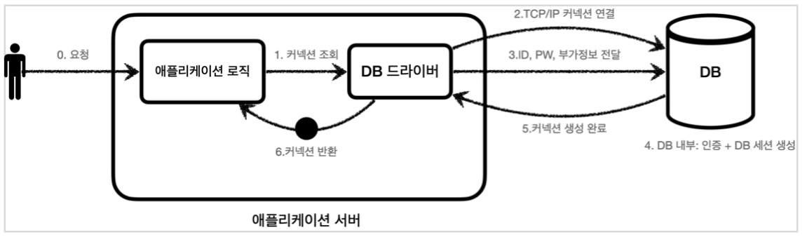 JDBC로 DB에 접근하려면 먼저 커넥션(JDBC의 커넥션)을 획득해야한다. 커넥션을 새로 생성하는 과정은 아래와 같이 여러 작업이 수행되기에 많은 시간이 소모된다.