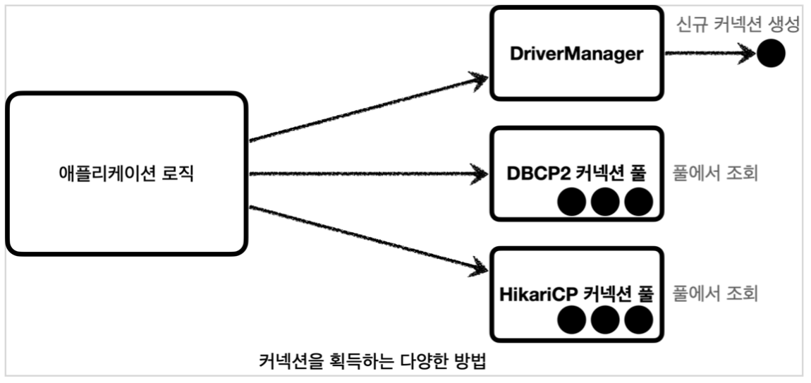 JDBC로 DB에 접근하려면 커넥션을 얻어야한다. 기존에는 JDBC DriverManger로 커넥션을 얻었지만 커넥션 풀이 등장함에 따라 커넥션을 얻을 수 있는 방법이 많아졌다.