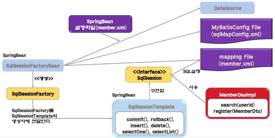 스프링에서 MyBatis를 사용하려면 SqlSessionFactoryBean, SqlSessionTemplate 빈 객체 등록이 필요하며, 아래와 같이 동작한다.