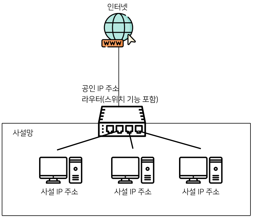 ip 주소에는 공인 ip 주소와 사설 ip 주소가 있다. 공인 ip 주소는 인터넷 서비스 제공자(ISP)가 제공하는 주소로 전 세계에서 유일한 주소이다. 사설 ip 주소는 IPv4의 주소 고갈 문제를 해결하기 나온 것으로 하나의 네트워크 안에서만 사용되는 주소이다. 쉽게 말하면 공인 ip 주소는 전 세계의 누구든지 알 수 있는 우편번호와 같으며 사설 ip 주소는 자신의 단체, 지역 안에서만 통용되는 주소(ex - 안방, 거실, 마당)와 같다. 따라서 사설 ip 주소는 네트워크 안에서 어떤 주소인지 알 수 있지만 네트워크 밖에서는 어디를 가리키는지 알 수 없는 주소가 된다. 사설 ip를 사용하는 사설망에서는 공인 ip 주소를 라우터에 할당하고 랜 안의 호스트에는 랜 관리자가 사설 ip를 부여하거나 라우터의 DHCP 기능을 사용해 주소를 자동으로 할당한다.