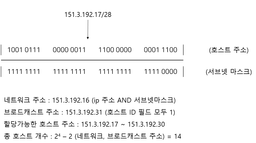 서브넷팅을 하게 되면 앞의 호스트 ID 비트 일부가 네트워크 ID 비트가 된다. 즉 호스트 ID 비트를 줄여 네트워크 ID 비트를 늘리고 그만큼의 서브넷을 만든다. 클래스로 구분해 놓은 네트워크는 네트워크 ID 필드가 정해져 있기에 네트워크 ID를 바로 알 수 있지만 여기서 서브넷팅을 하니 ip 주소에서 앞의 몇비트가 네트워크 ID인지 알 수 없게 되었다. 그래서 서브넷 마스크라는 값을 사용한다. ip의 네트워크 ID와 호스트 ID를 구분하는 32비트 값을 서브넷 마스크라 한다. 네트워크 ID에 해당하는 비트는 1이고 호스트 ID에 해당하는 비트는 0값을 가진다. ip 주소에 서브넷 마스크를 마스킹하면 즉 비트 AND 연산을 하게 되면 네트워크 주소를 얻을 수 있다.