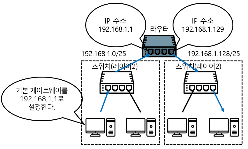 호스트에서 다른 네트워크에 있는 호스트로 데이터를 보내려면 기본 게이트웨이 주소를 설정해야한다. 게이트웨이란 패킷이 네트워크 밖으로 나가기 위한 출입구를 말한다. 위 그림에서는 라우터를 뜻한다. 라우터가 패킷을 다른 네트워크로 보내기 때문에 라우터는 패킷이 밖으로 나가기 위한 출입구(게이트웨이)가 된다. 라우터, 공유기, L3 스위치 등 다양한 장비가 게이트웨이가 될 수 있다. 기본 게이트웨이 주소를 라우터의 ip 주소로 설정한다.