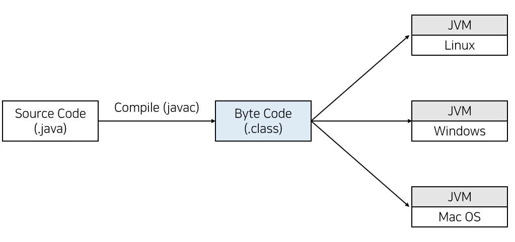 JVM을 통해 자바 응용프로그램은 운영체제에 독립적으로 실행된다. 자바 이전의 언어인 C/C++로 만들어진 실행 파일이(.exe)나 목적 파일(.obj)은 운영체제에 종속적이다. - 객체지향언어