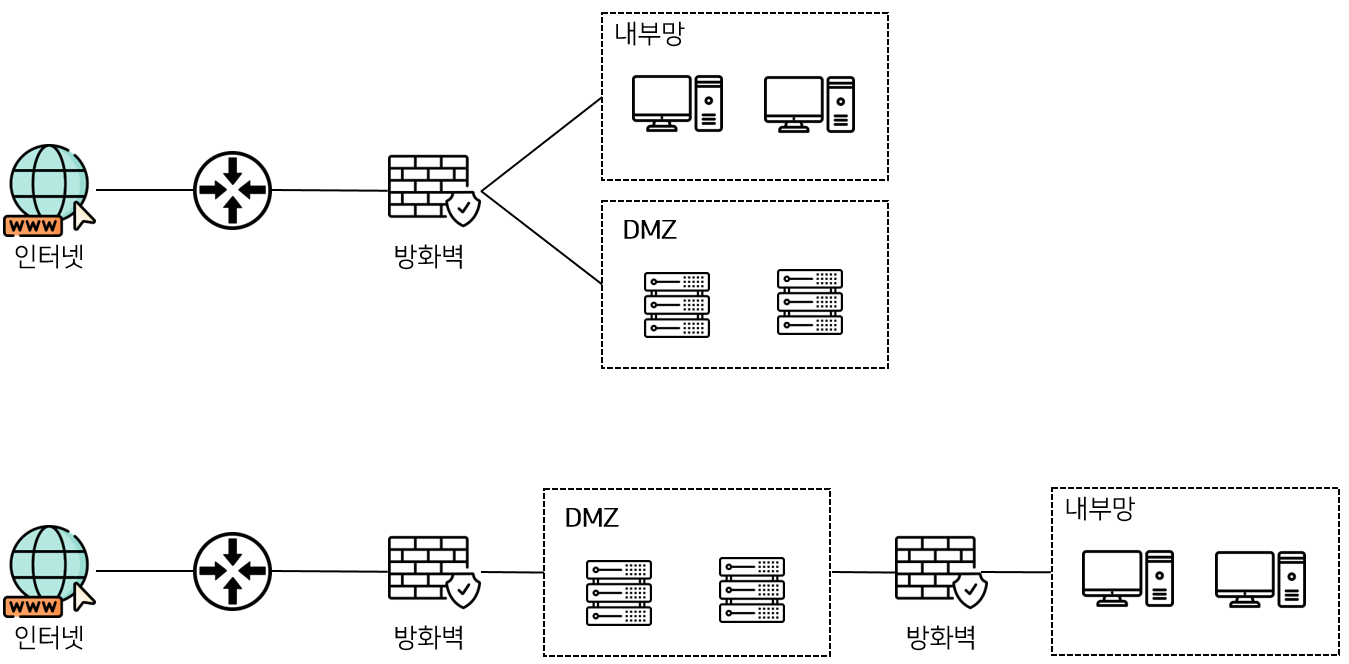 왜 DMZ를 둘까? 회사의 웹서버, 메일서버, DNS 서버등은 내부에서만 사용할 수도 있지만 외부에서의 접근이 필요할 수도 있다. 회사의 웹서버나 메일 서버를 외부에 공개할 때 필요하다. 하지만 내부망 전체를 외부에 공개해서는 안된다. 특히 파일 서버, DB 서버가 외부에 노출되어 서버의 제어권을 뺏기면 심각한 일이 일어난다. 그래서 외부에 공개할 서버는 DMZ에 두고 공개하지 않을 서버나 호스트들은 내부망에 둔다.