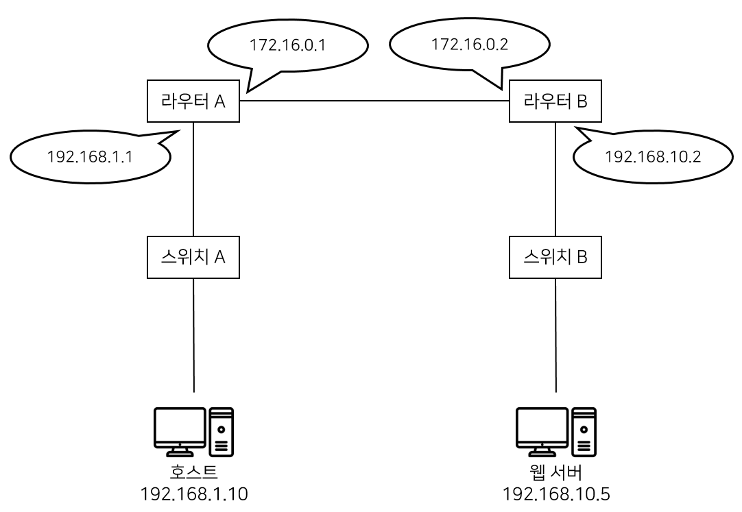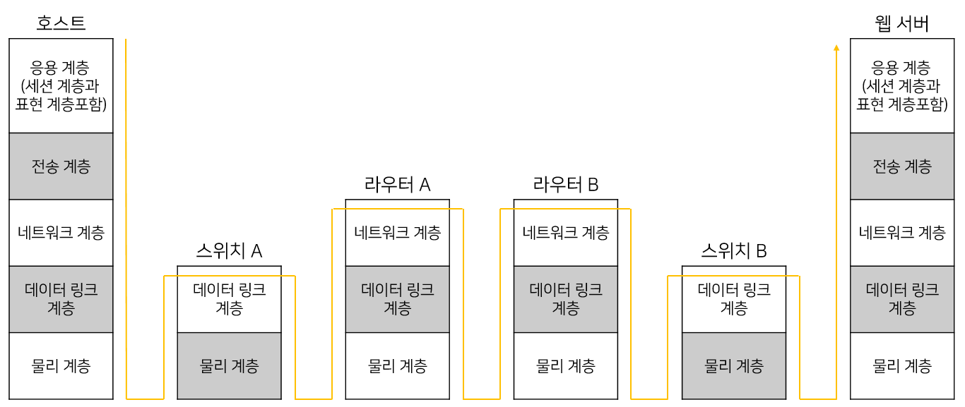 위의 네트워크에서 호스트가 웹 서버로 요청을 보내면 아래와 같이 데이터가 전송되면서 캡슐화와 역캡슐화가 진행된다. 각 장치별로 어떤 일이 일어나는지 살펴보자.