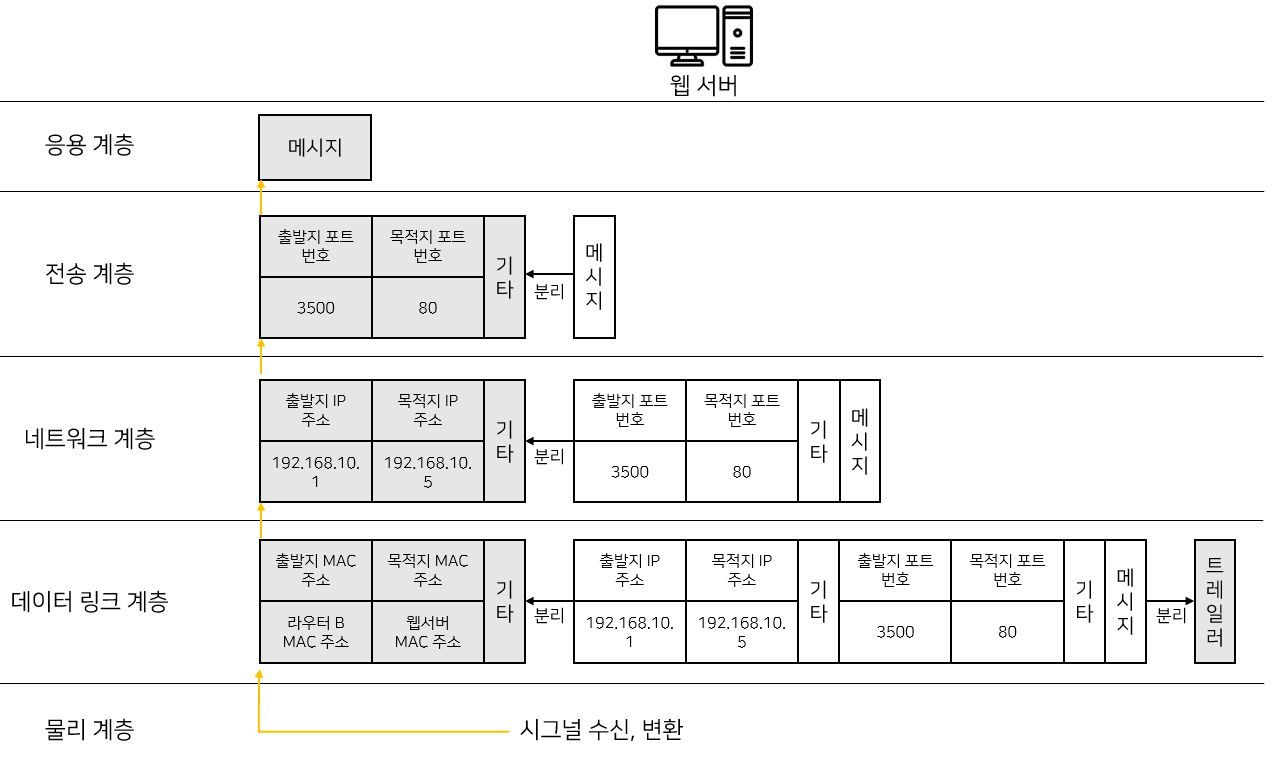 웹 서버에서 진행되는 과정이다. 역캡슐화가 이뤄지고 최종적으로 메시지가 웹 서버 프로세스로 전송된다. OSI 7 계층, TCP/IP 스택에 의해 체계적으로 데이터 통신이 이루어진다.