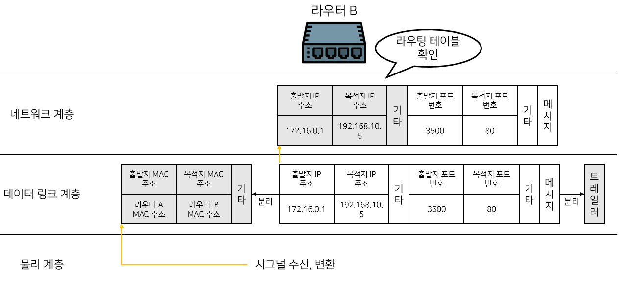 - 데이터링크 계층 : 네트워크 장비 간의 오류 제어, 흐름 제어