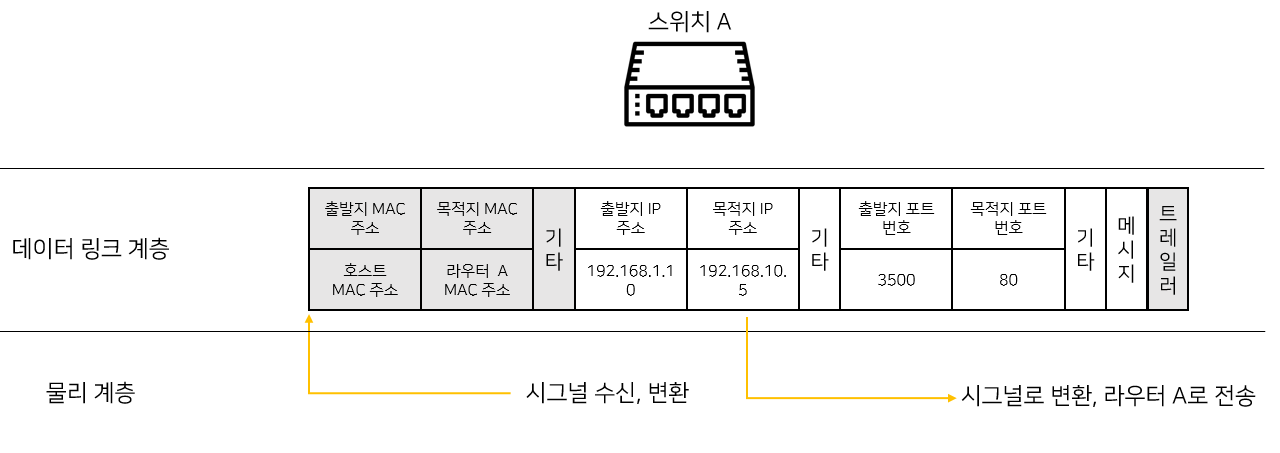 스위치 A에서 진행되는 과정이다. 스위치는 목적지 MAC주소를 보고 이더넷 프레임을 전송한다.
