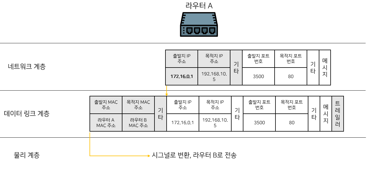 라우터 A에서 진행되는 과정이다. 라우터는 목적지 IP 주소를 보고 패킷을 라우팅한다. NAT 장치(라우터 A)에 의해 출발지 IP 주소가 변환된다.