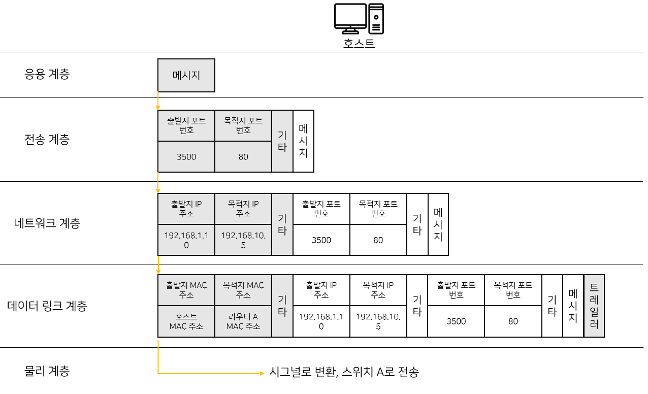 호스트에서 진행되는 과정이다. 캡슐화가 이뤄지고 시그널로 변환되어 전송된다.