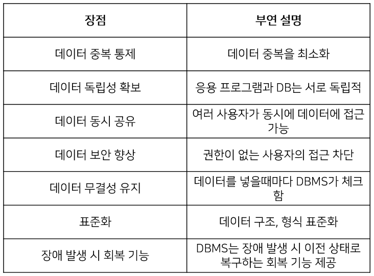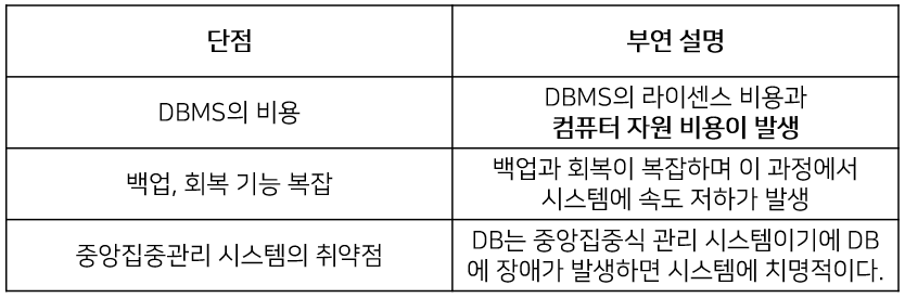 - 데이터 파일에 대한 동시 공유 · 회복 · 보안 기능이 부족한 문제 등등