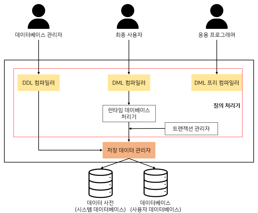DB 관리자(DBA)는 주로 데이터 정의어와 제어어를 사용해 DB 설계, 보안, 성능 분석 등의 DB 관리를 수행하며 응용 프로그래머는 주로 데이터 조작어를 사용해 DB로부터 데이터를 가져오거나 저장한다.