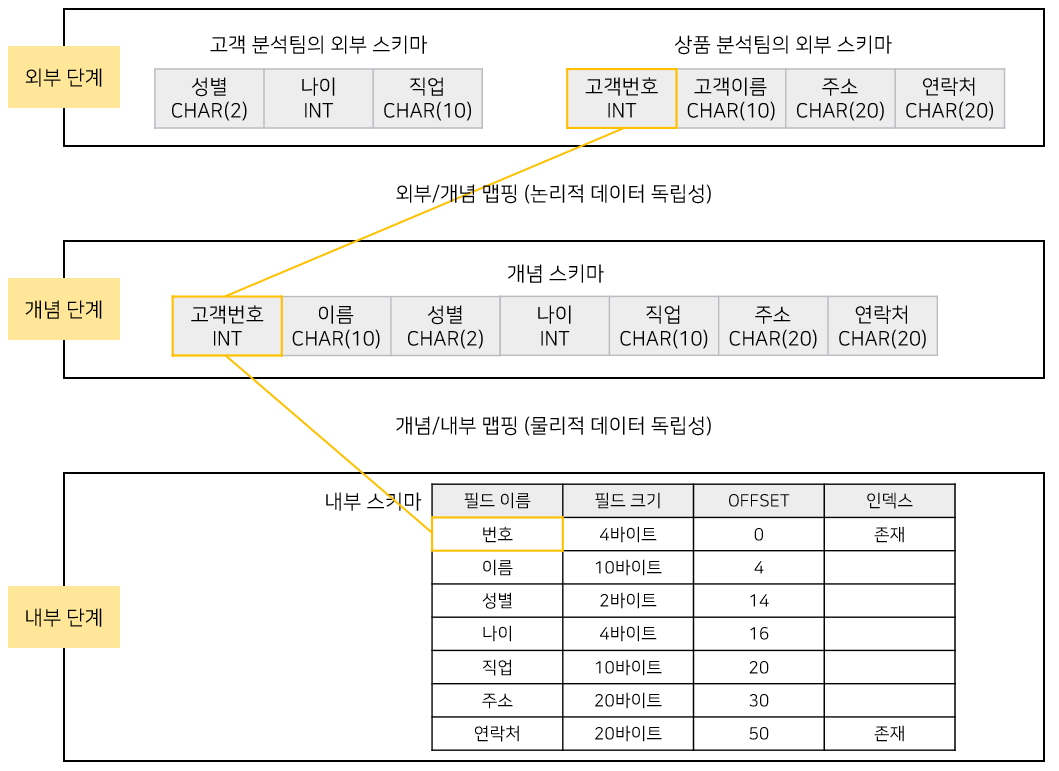 - 사용자 편의 증가 : 사용자(응용 프로그램)은 외부 스키마만 파악하면 DB를 쓸 수 있다. 상품 분석팀이 외부 스키마의 고객 번호 정보를 가져온다 해보자. 그럼 DBMS의 외부/개념 맵핑에 의해 개념 스키마의 고객번호로 대응되고 다시 DBMS의 개념/내부 맵핑에 의해 내부 스키마의 번호 필드로 대응된다. DBMS는 이 번호 필드의 정보를 제공함으로써 사용자는 내부 구조를 몰라도 데이터를 가져올 수 있다. 만약 추상화 되어 있지 않다면 사용자는 파일의 물리적인 구조를 파악하고 데이터를 가져와야한다. 상당히 번거로울 수 밖에 없다. 이것은 개념 스키마를 작성하는 DB 관리자에게도 해당된다.