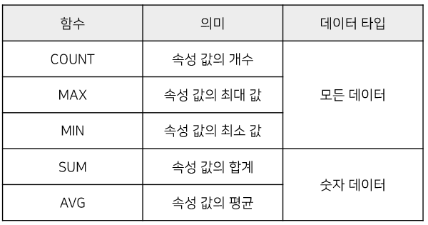 특정 속성 값을 통계적으로 계산하기 위해 집계 함수를 사용한다. 집계 함수는 널인 속성 값은 제외하고 계산한다. 집계 함수는 WHERE 절에서 사용할 수 없다.
