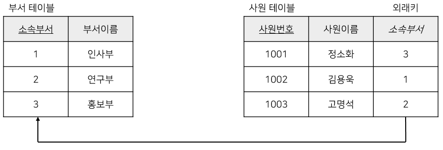 - ON DELETE NO ACTION : 튜플을 삭제하지 못하게 한다. 부서번호가 3인 튜플을 참조하는 사원 튜플(정소화)이 있으므로 부서번호가 3인 부서 튜플을 삭제하지 못하게 한다.