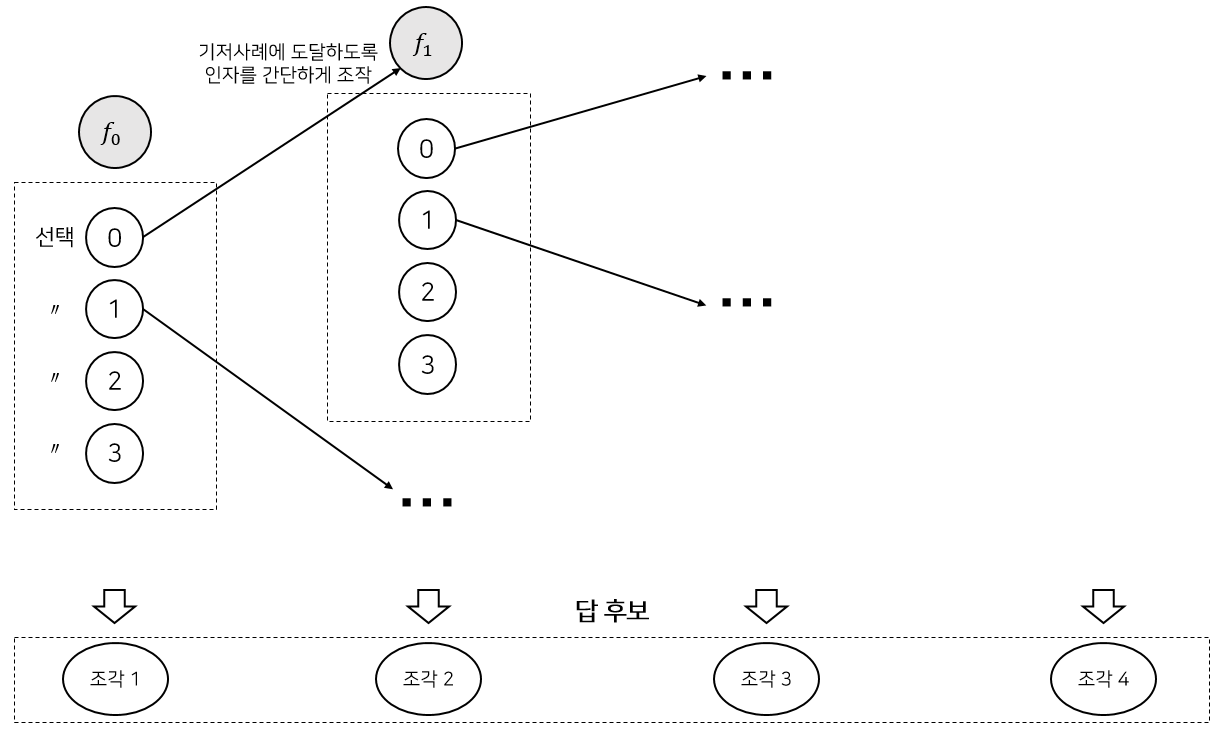 아래는 4개의 수의 순열을 구하는 과정을 위 동작 방식에 맞추어 그림으로 나타낸 것이다. f₀와 같이 수행해야 할 작업과 작업을 적용할 자료의 조합을 문제라 하며 f₁과 같이 기저 사례에 도달하도록 원래 문제의 인자가 간단하게 조작된 문제를 원래 문제의 부분 문제라 한다.