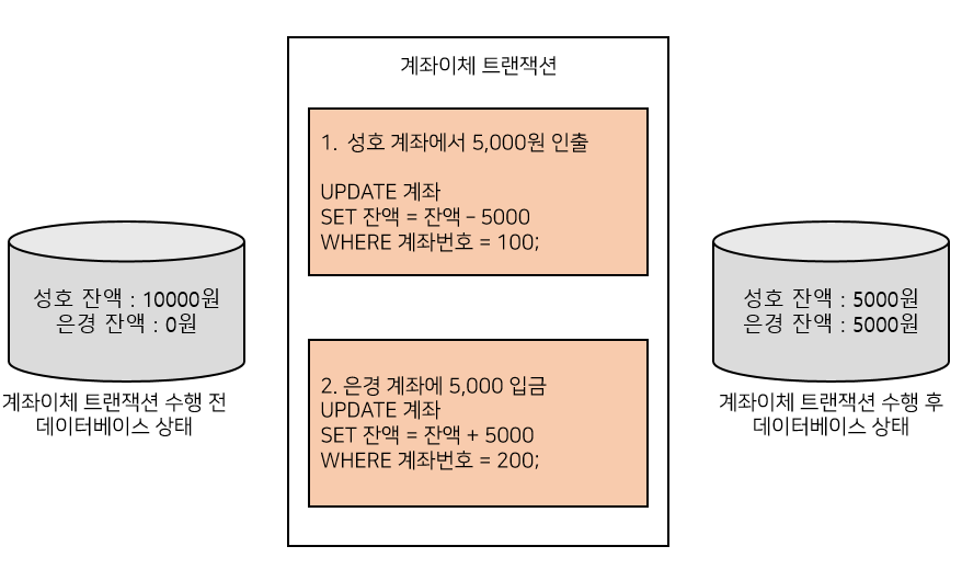 계좌이체 트랜잭션은 2개의 UPDATE 문으로 구성되어 있다. 하나는 성호 계좌에서 5000원을 감소시키는 UPDATE문이며 다른 하나는 은경 계좌에 5000원을 증가시키는 UPDATE문이다.